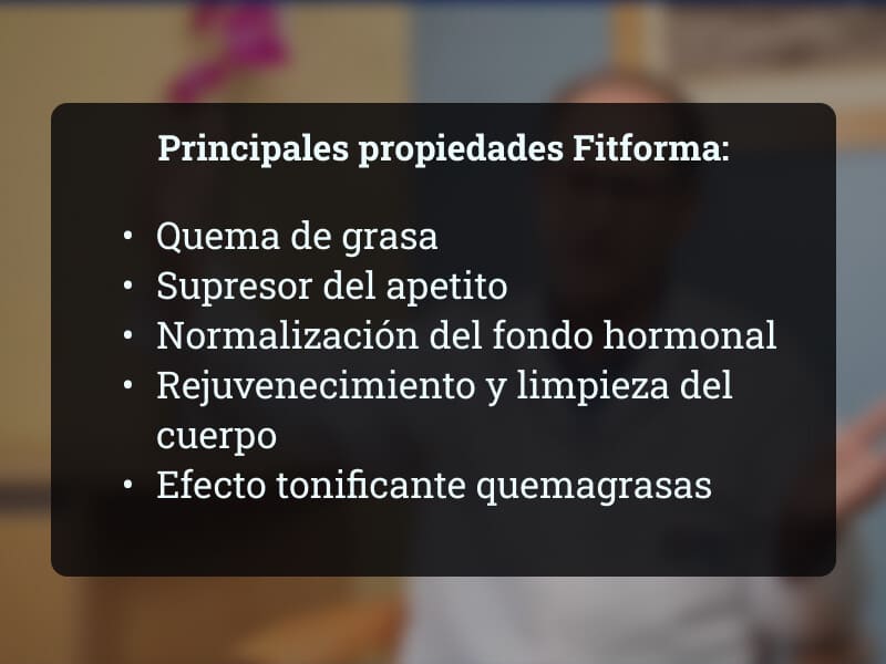 Se ha demostrado que FitForma tiene un poderoso efecto sobre la aceleración del metabolismo y la quema de masa grasa. Está indicado para el uso de personas con sobrepeso, personas con metabolismo alterado y diabetes mellitus.